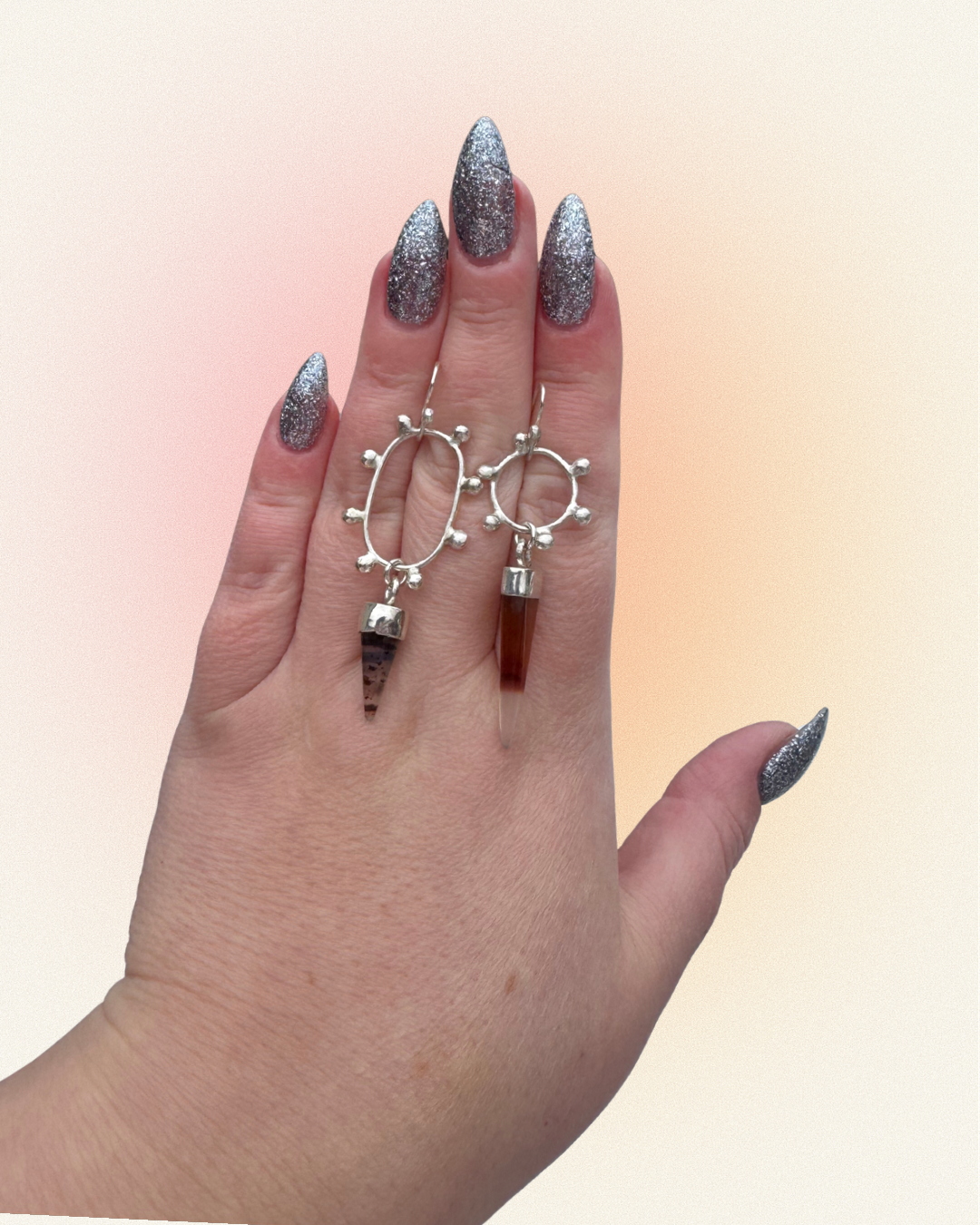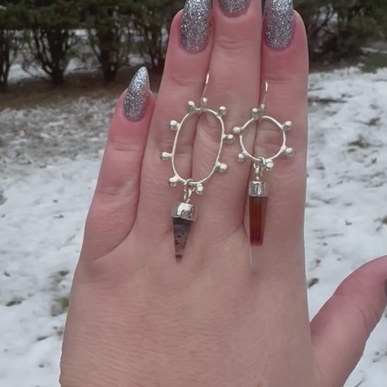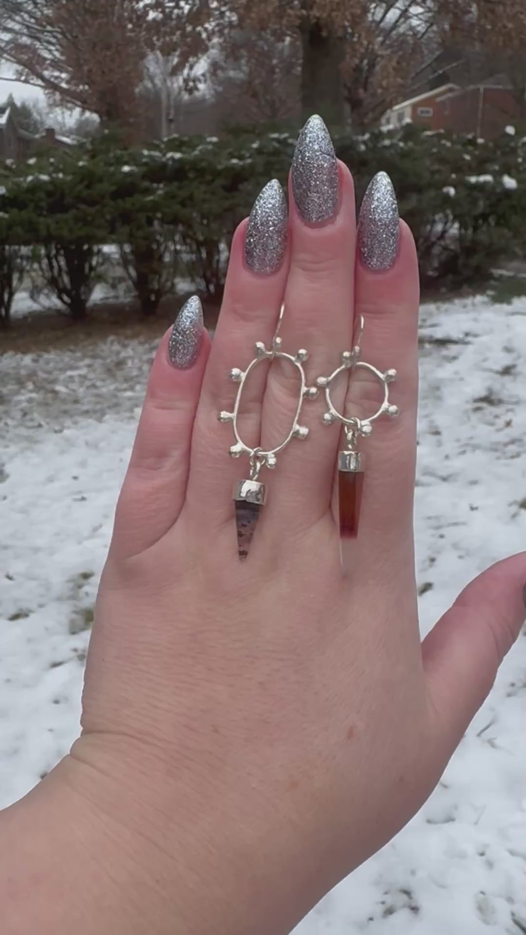This gorgeous material is sourced from the woman who mines and cuts it! The Montana agates are set in sterling and fine silver with fine silver baubles for added interest. The earrings are approximately 2” long with sterling silver earring wires. These earrings are approximately 6 grams each, which most people find a comfortable weight.