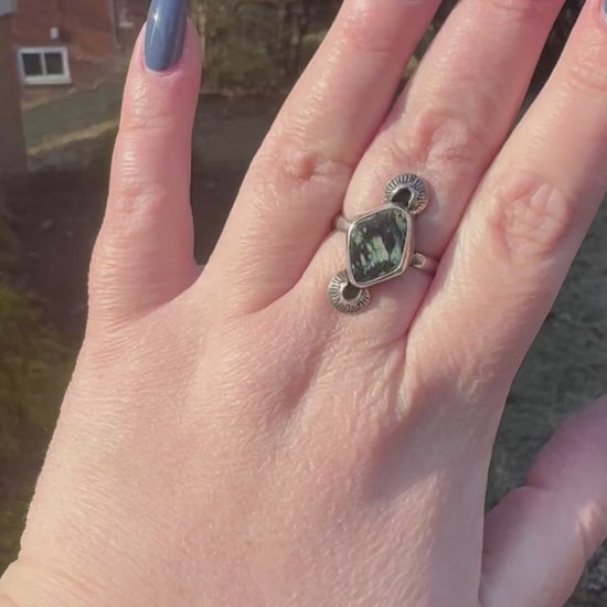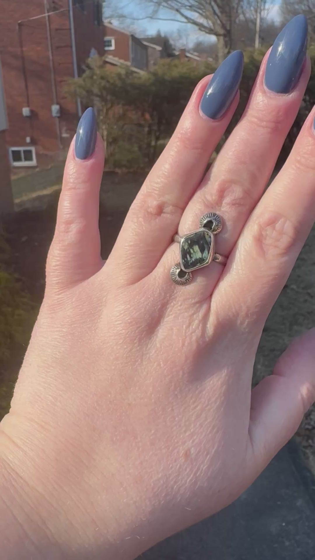 This unique piece of blue boy variscite is set in fine and sterling silver with hand-stamped and domed accents. Ring band measures size 9.