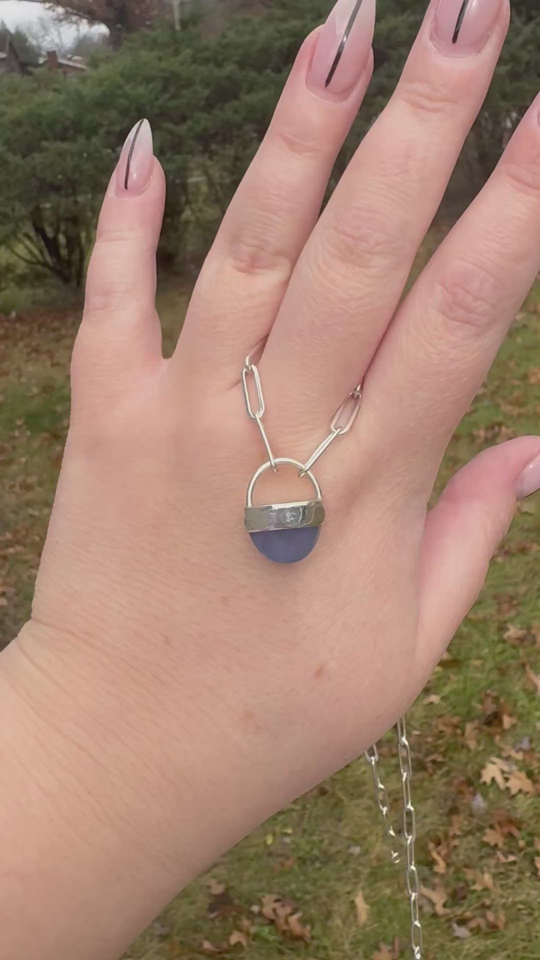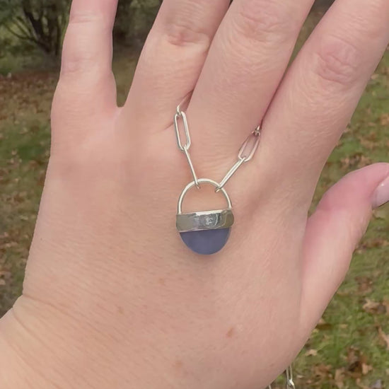 This piece of chalcedony has a unique blue/purple/periwinkle color. It’s set in fine and sterling silver on an 18” sterling paperclip chain.