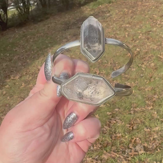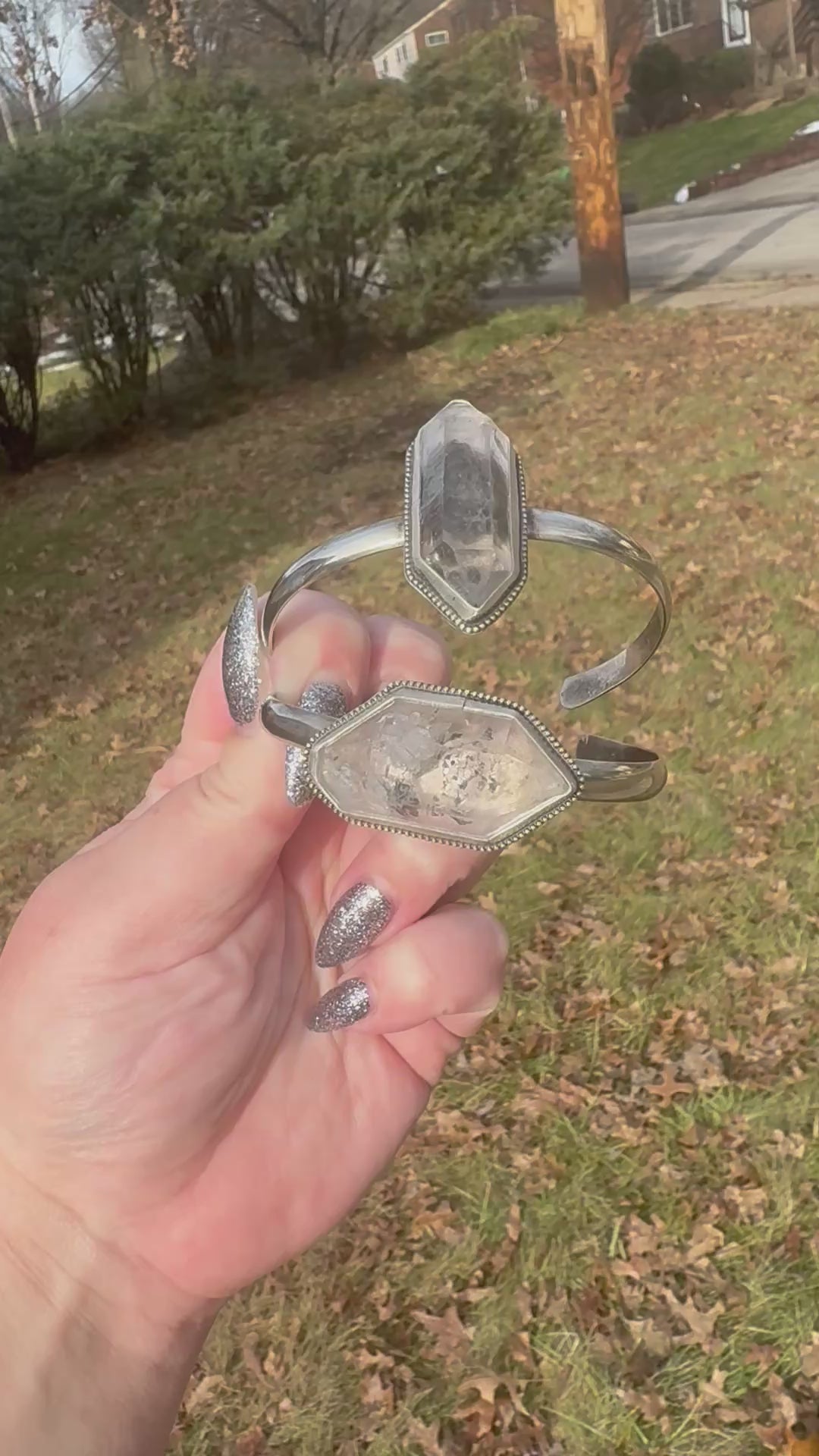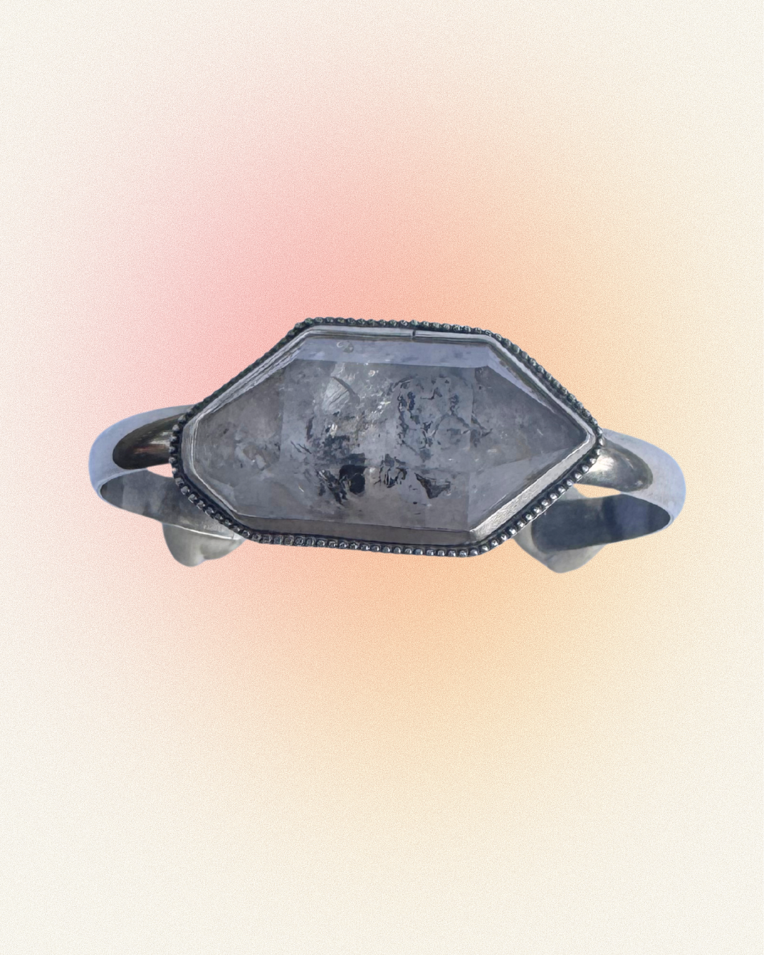 This handmade statement cuff is bold and beautiful. It features a stunning Tibetan quartz crystal set in sterling and fine silver with a silver beaded border. The cuff measures 5.5” with a 1.5” opening. There can be a slight adjustment in the size, but refrain from opening and closing the cuff size repeatedly- this can cause the silver to work harden and become brittle- keep the overall shape of the cuff.