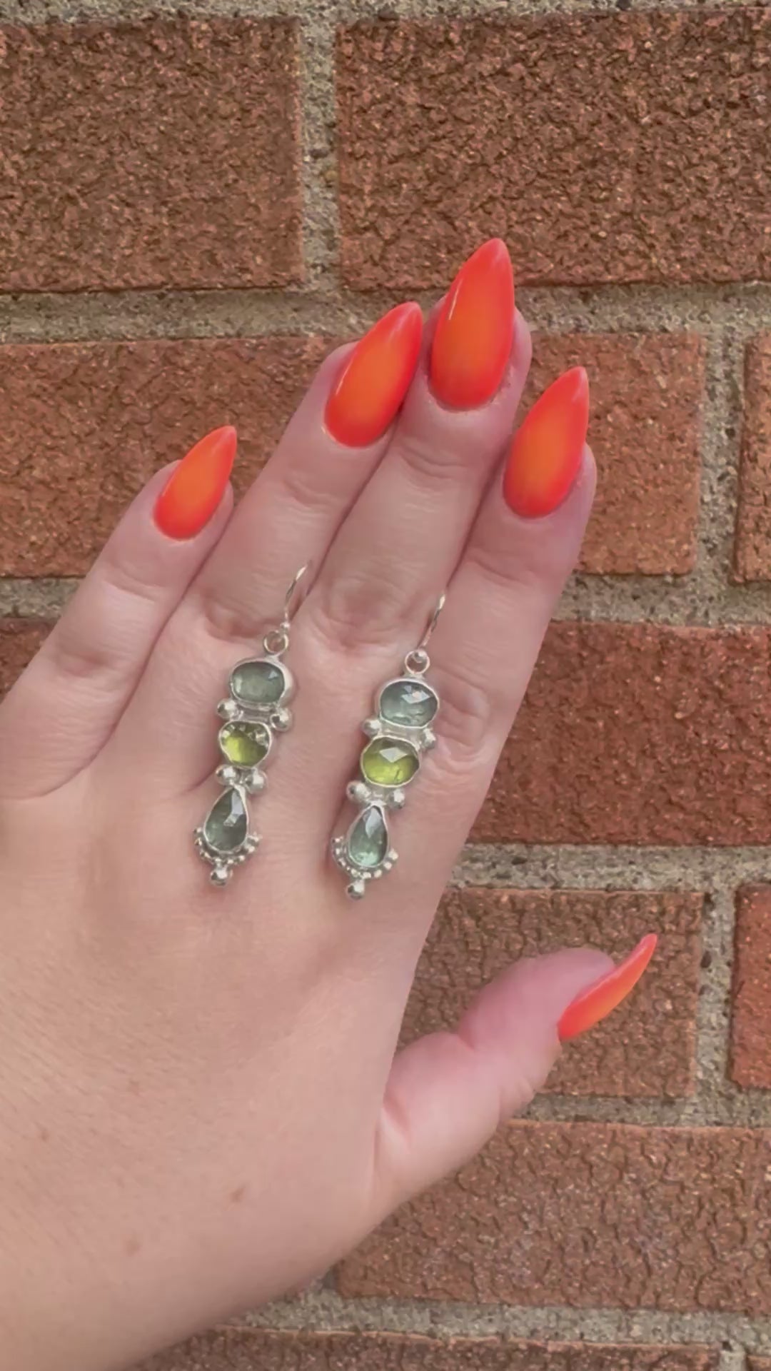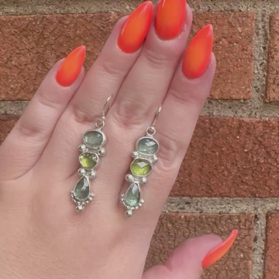 These beautiful dangle earrings feature rose cut kyanite and peridot. The stones are set in fine and sterling silver with silver ball adornments. The earrings are approximately 1.5” long with sterling silver ear wire.