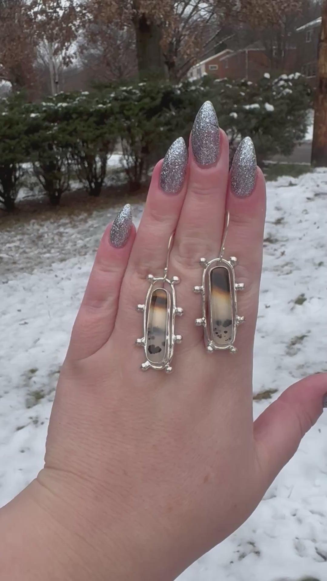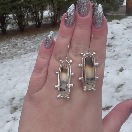 This gorgeous material is sourced from the woman who mines and cuts it! The Montana agates are set in sterling and fine silver with fine silver baubles for added interest. The earrings are approximately 1.5” long with sterling silver earring wires. These are on the heavier side- 10grams each and may not be suitable for weight-sensitive ears.
