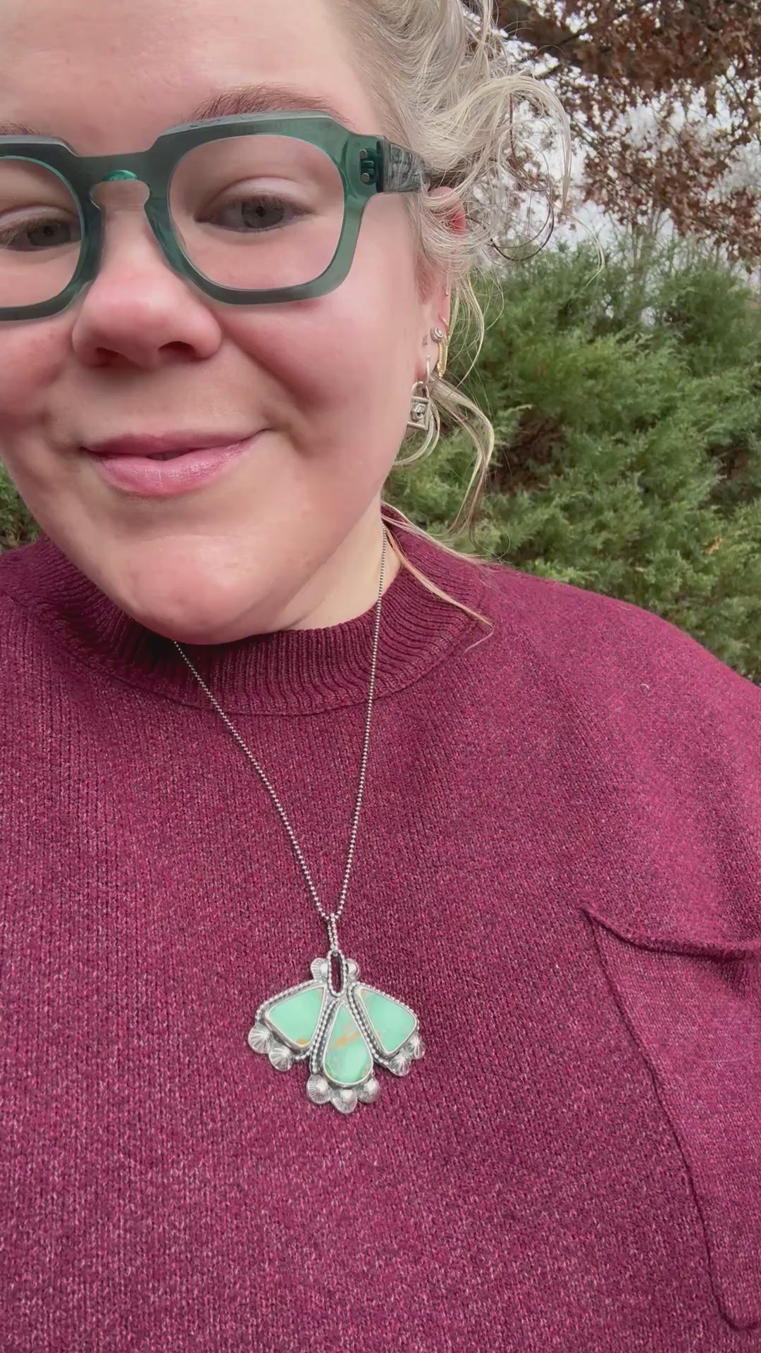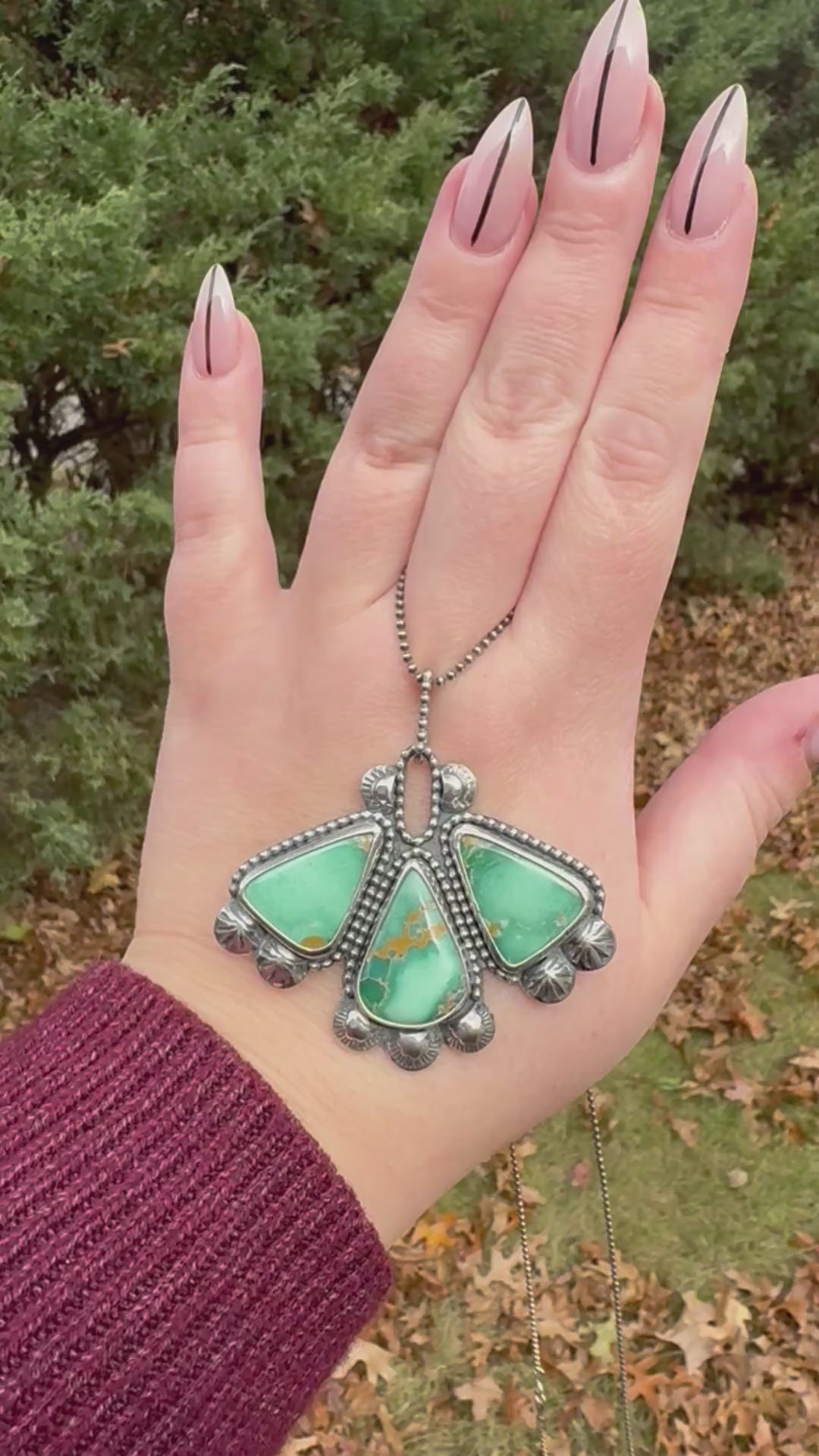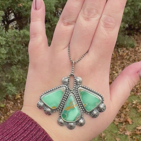 This statement necklace features three gorgeous pieces of broken arrow variscite set in fine and sterling silver. The adornments are hand stamped and shaped out of sterling silver. It’s set on a 24” beaded sterling chain. The piece has been oxidized for a vintage look.