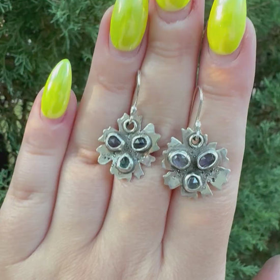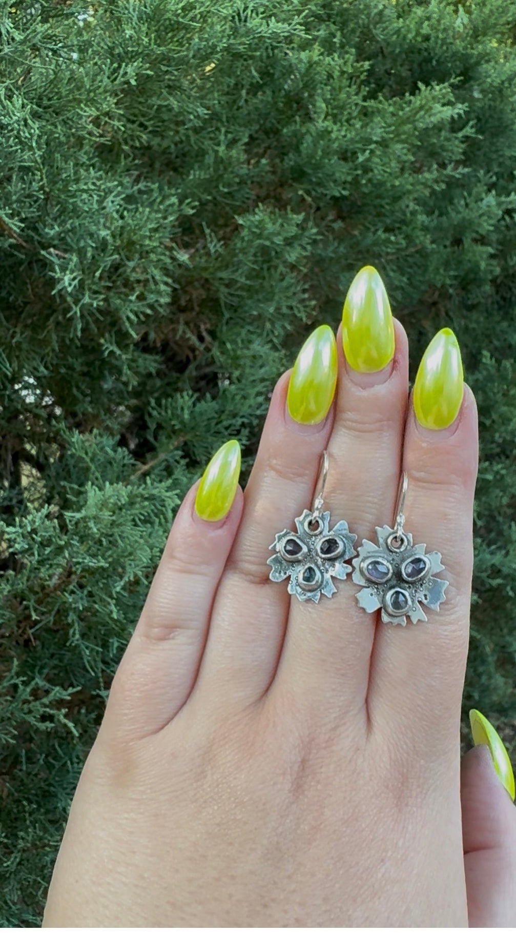 These fun floral earring feature purple hues of spinel set in fine and sterling silver with hand stamped texturing. They hang approximately 3/4” long.