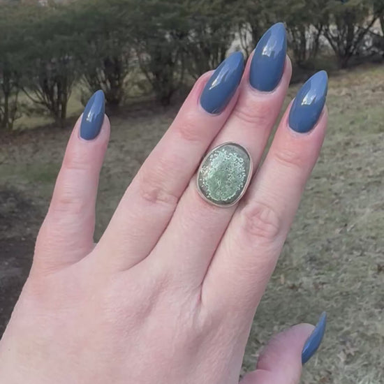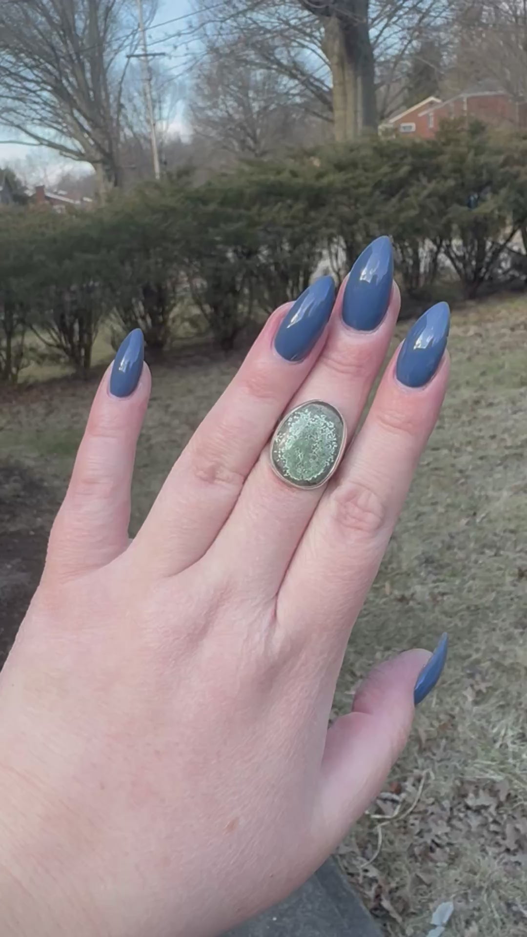 This gorgeous piece of turtleback variscite is set in fine and sterling silver. Ring band measuring size 7.75.