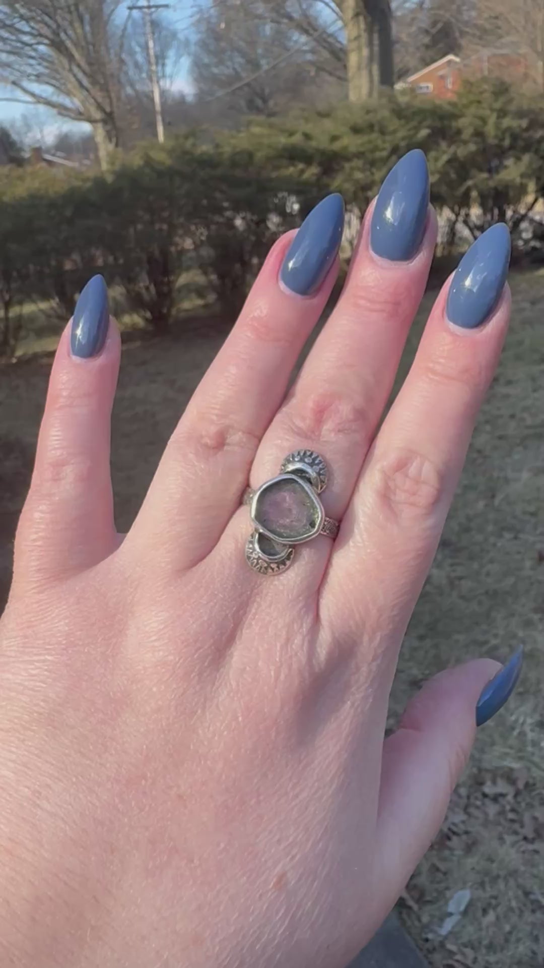 This slice of watermelon tourmaline is set in fine and sterling silver with hand-stamped and domed accents. Ring band measures size 8.5.
